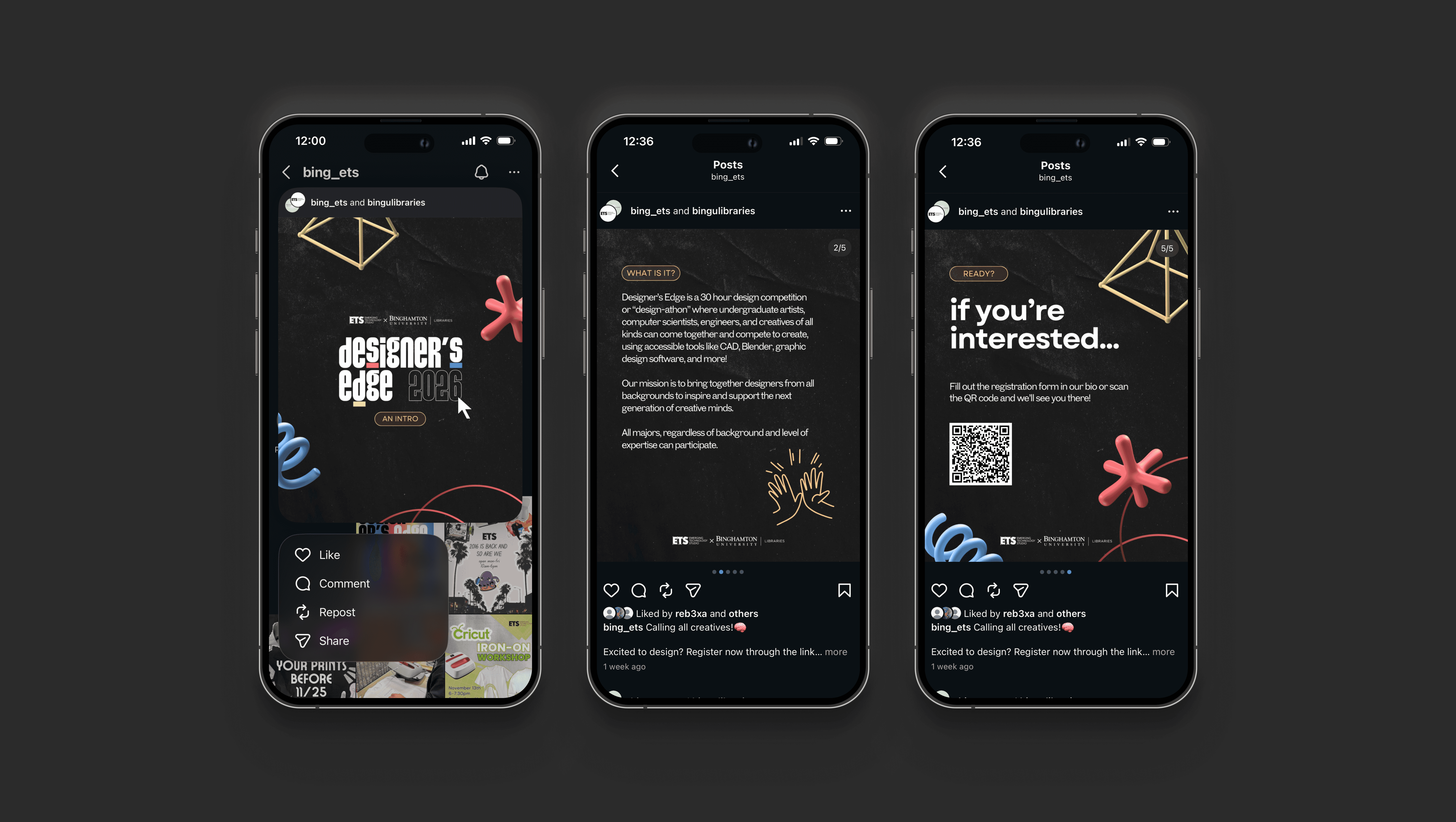 The Emerging Technology Studio (ETS) is Binghamton University's Premiere Makerspace providing 3D printing, 2D crafts, and more. Since Spring 2025, the ETS hosts an annual "design-a-thon" where undergraduate artists, computer scientists, engineers and creatives of all backgrounds compete in a 30 hour design competition. I was in charge of leading the marketing materials, logos, and merchandise of Designer's Edge 2026.