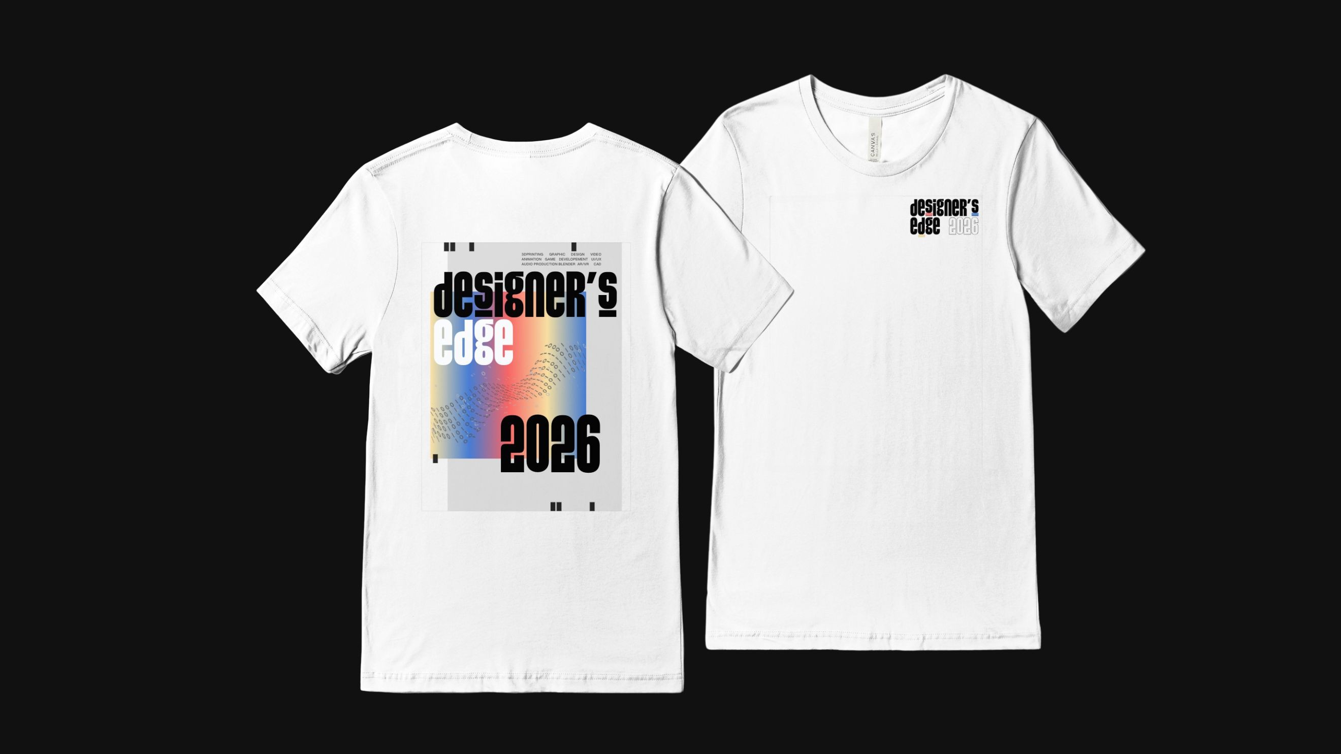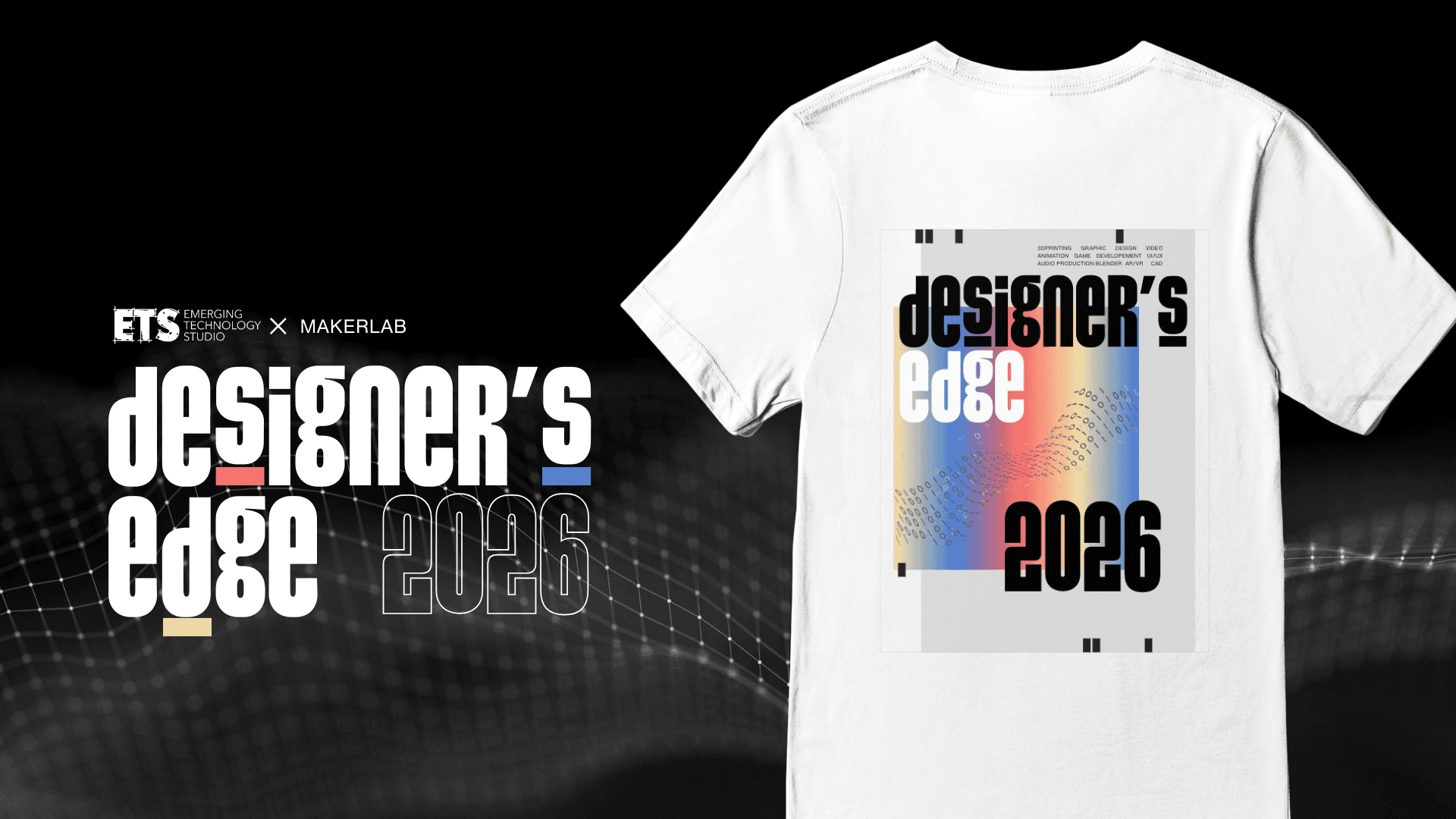 The Emerging Technology Studio (ETS) is Binghamton University's Premiere Makerspace providing 3D printing, 2D crafts, and more. Since Spring 2025, the ETS hosts an annual "design-a-thon" where students from all backgrounds participate in a 30 hour design competition. I was in charge of the marketing materials, logos, and merchandise of Designer's Edge 2026.