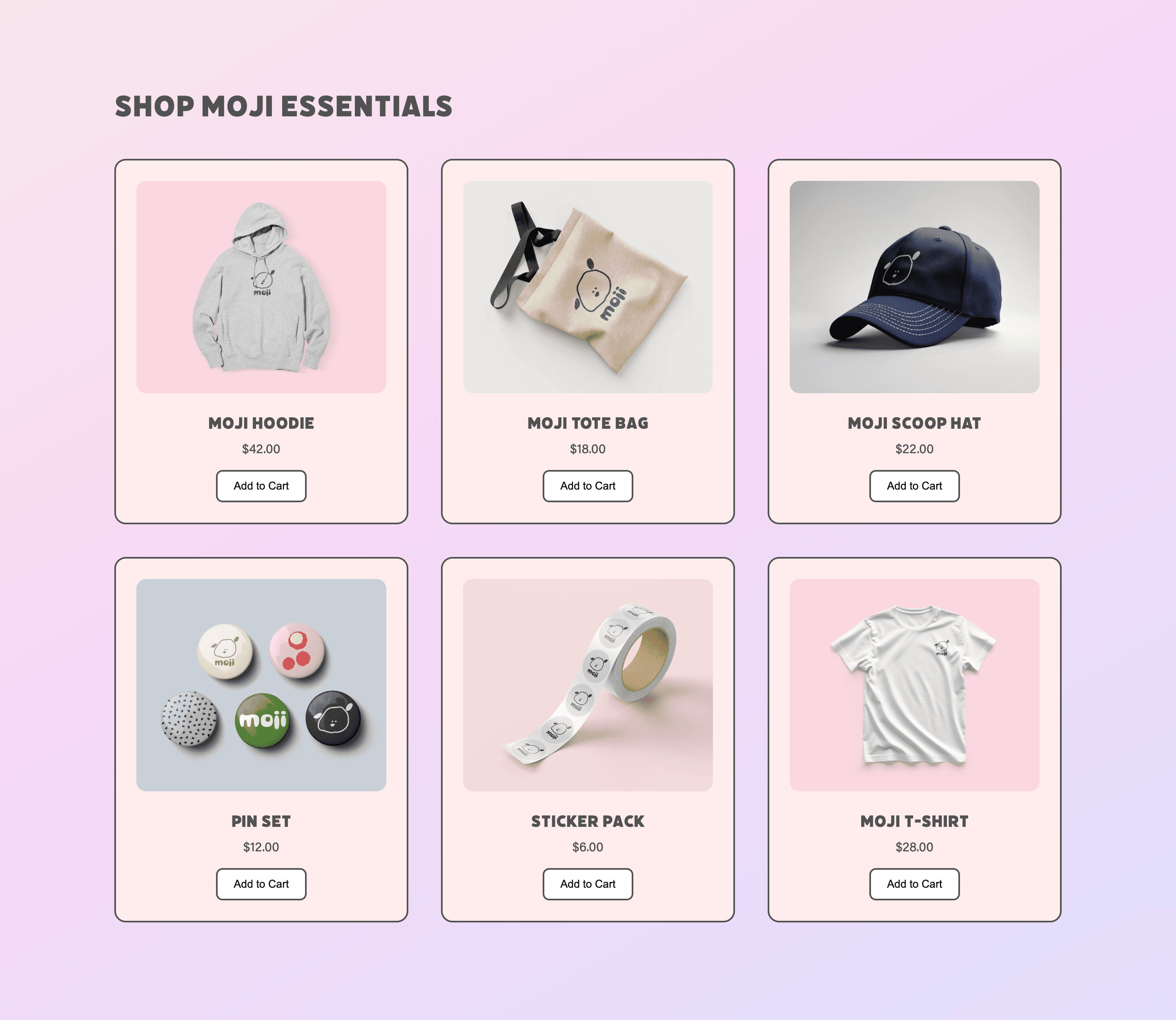 I designed and built a storefront webpage that showcases Moji’s products, allowing customers to easily browse and shop.