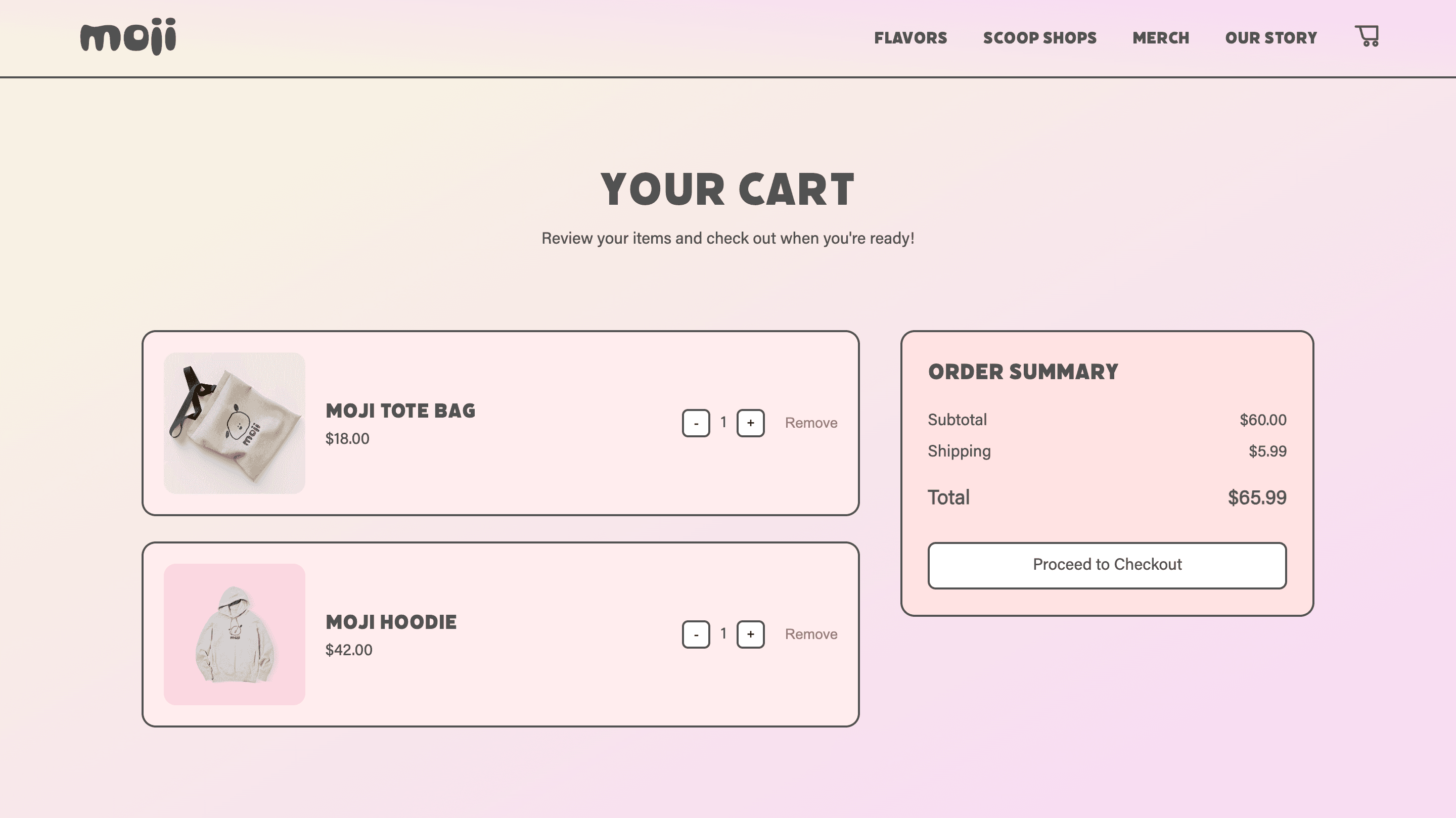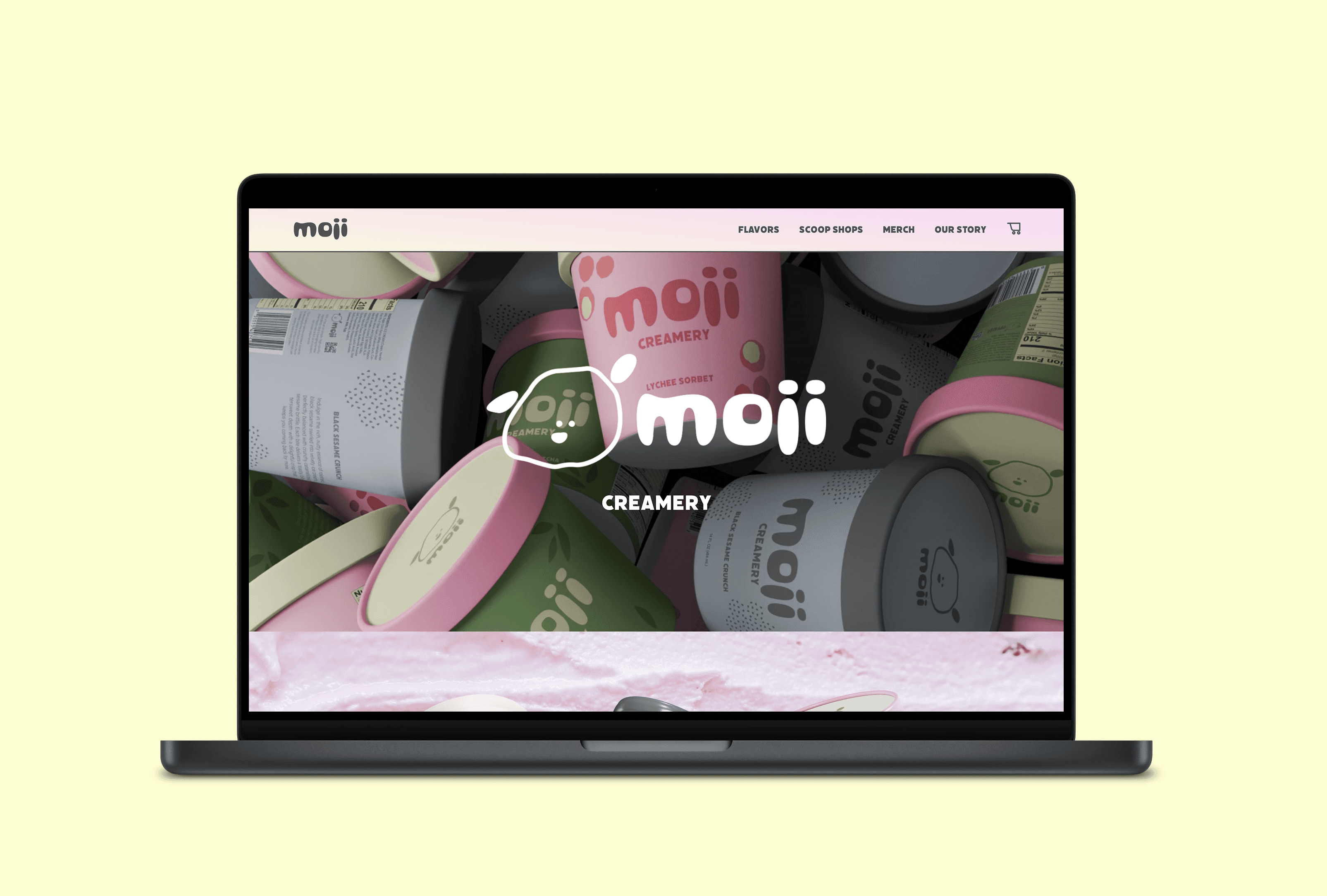 For this project, I designed and coded a website to showcase a previous body of work. I chose to feature Moji, a typography and branding project, and translated it into a storefront-style website highlighting Moji’s ice cream flavors, locations, merchandise, and brand story.